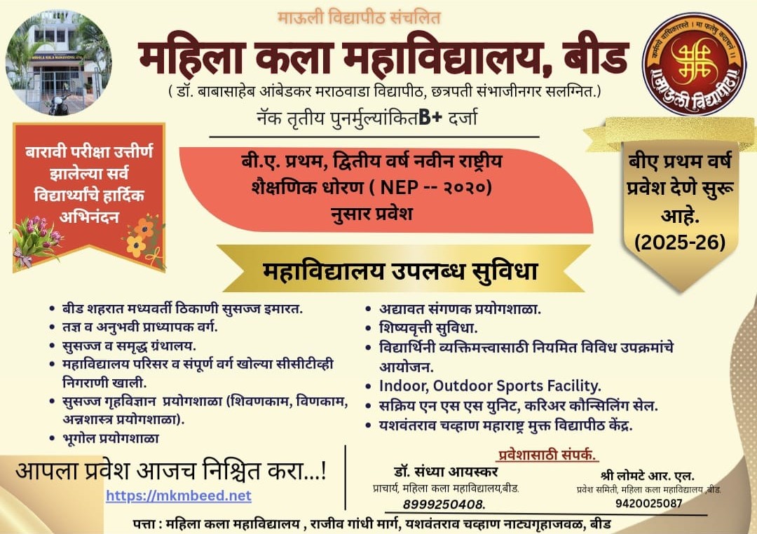 Mauli Vidyapeeth’s Mahila Kala Mahavidhyalaya located at centre of the Beed city and college has affiliated to Dr. Babasaheb Ambedkar Marathwada University, Aurangabad (Maharasthra) College having a single faculty of Arts & It is an aided college of Arts.
